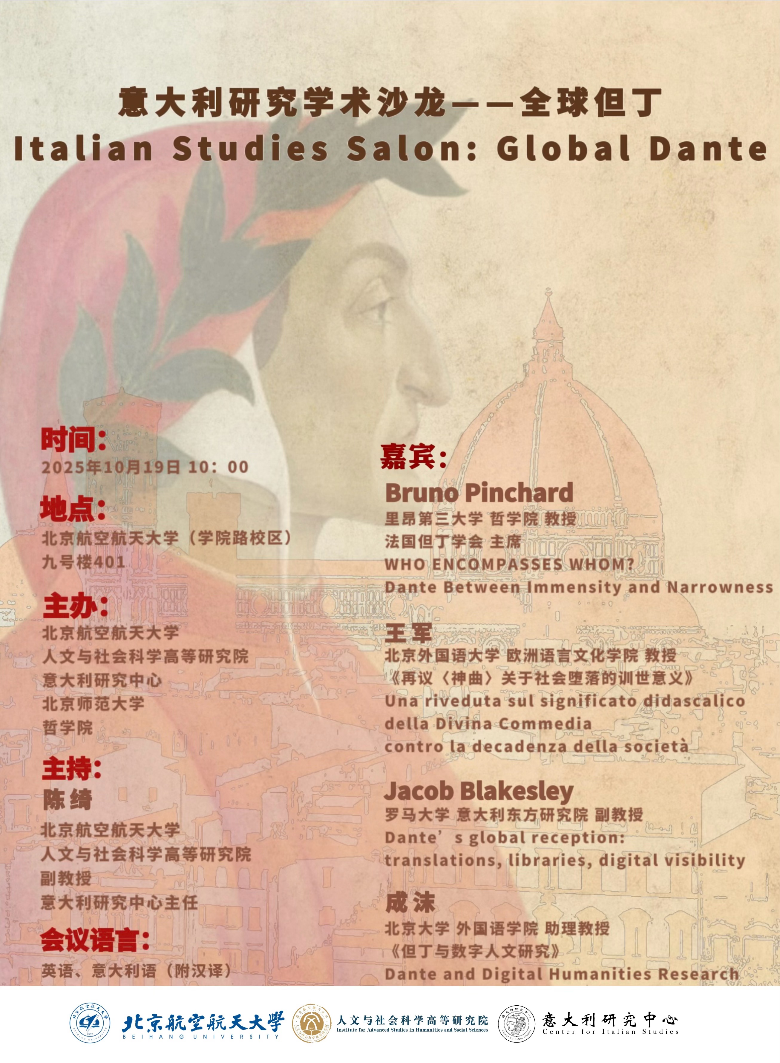 10月19日,北京航空航天大学人文与社会科学高等研究院、意大利研究中心,联合北京师范大学哲学院在学院路校区9号楼401会议室共同举办“全球但丁”意大利研究学术沙龙。